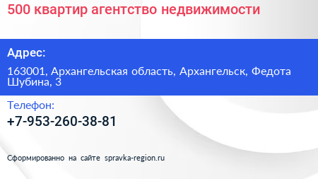 500 квартир, агентство недвижимости по адресу 163001, Архангельская область, Архангельск, Федота Шубина, 3 в дальнейшем Организация, размещена в следующих категориях: