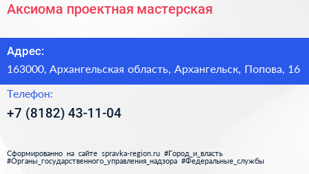 Аксиома, проектная мастерская по адресу 163000, Архангельская область, Архангельск, Попова, 16 в дальнейшем Организация, размещена в следующих категориях:
