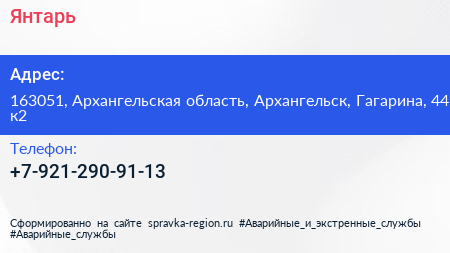 Янтарь по адресу 163051, Архангельская область, Архангельск, Гагарина, 44 к2 в дальнейшем Организация, размещена в следующих категориях: