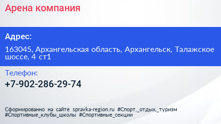 Арена, компания по адресу 163045, Архангельская область, Архангельск, Талажское шоссе, 4 ст1 в дальнейшем Организация, размещена в следующих категориях: