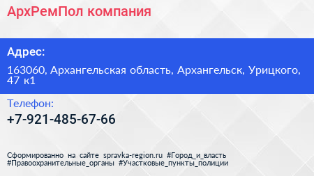 АрхРемПол, компания по адресу 163060, Архангельская область, Архангельск, Урицкого, 47 к1 в дальнейшем Организация, размещена в следующих категориях: