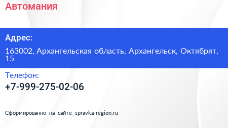 Автомания по адресу 163002, Архангельская область, Архангельск, Октябрят, 15 в дальнейшем Организация, размещена в следующих категориях: