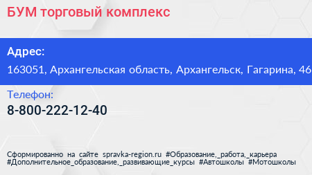 БУМ, торговый комплекс по адресу 163051, Архангельская область, Архангельск, Гагарина, 46 в дальнейшем Организация, размещена в следующих категориях: