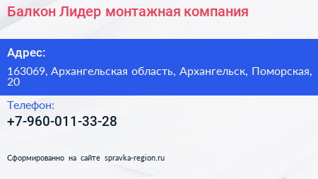 Балкон Лидер, монтажная компания по адресу 163069, Архангельская область, Архангельск, Поморская, 20 в дальнейшем Организация, размещена в следующих категориях: