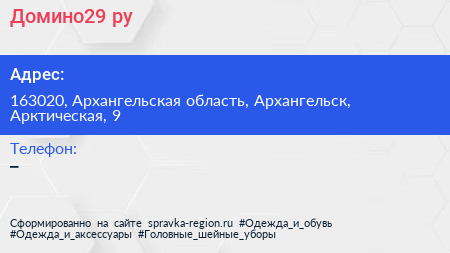 Домино29.ру по адресу 163020, Архангельская область, Архангельск, Арктическая, 9 в дальнейшем Организация, размещена в следующих категориях: