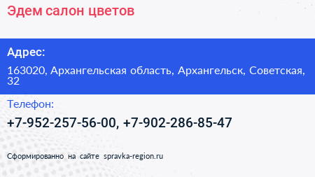 Эдем, салон цветов по адресу 163020, Архангельская область, Архангельск, Советская, 32 в дальнейшем Организация, размещена в следующих категориях: