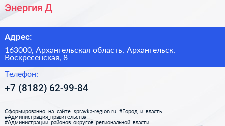 Энергия Д по адресу 163000, Архангельская область, Архангельск, Воскресенская, 8 в дальнейшем Организация, размещена в следующих категориях: