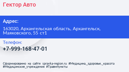 Гектор-Авто по адресу 163020, Архангельская область, Архангельск, Маяковского, 55 ст1 в дальнейшем Организация, размещена в следующих категориях: