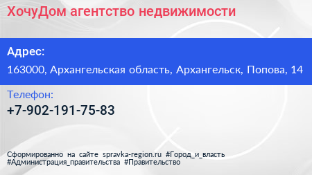ХочуДом, агентство недвижимости по адресу 163000, Архангельская область, Архангельск, Попова, 14 в дальнейшем Организация, размещена в следующих категориях: