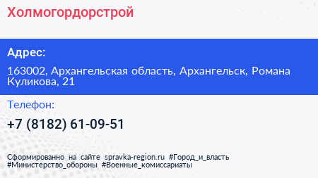 Холмогордорстрой по адресу 163002, Архангельская область, Архангельск, Романа Куликова, 21 в дальнейшем Организация, размещена в следующих категориях: