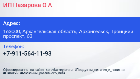 ИП Назарова О.А. по адресу 163000, Архангельская область, Архангельск, Троицкий проспект, 63 в дальнейшем Организация, размещена в следующих категориях: