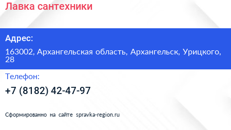 Лавка сантехники по адресу 163002, Архангельская область, Архангельск, Урицкого, 28 в дальнейшем Организация, размещена в следующих категориях: