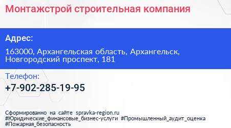 Монтажстрой, строительная компания по адресу 163000, Архангельская область, Архангельск, Новгородский проспект, 181 в дальнейшем Организация, размещена в следующих категориях: