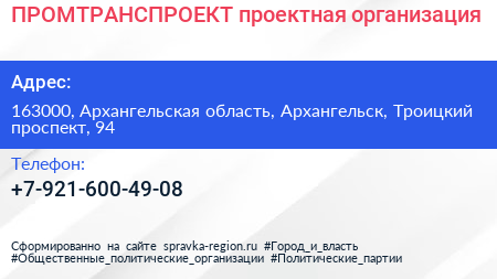ПРОМТРАНСПРОЕКТ, проектная организация по адресу 163000, Архангельская область, Архангельск, Троицкий проспект, 94 в дальнейшем Организация, размещена в следующих категориях: