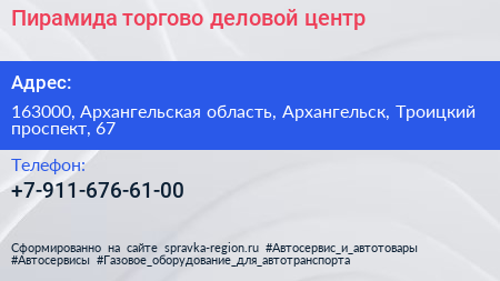 Пирамида, торгово-деловой центр по адресу 163000, Архангельская область, Архангельск, Троицкий проспект, 67 в дальнейшем Организация, размещена в следующих категориях:
