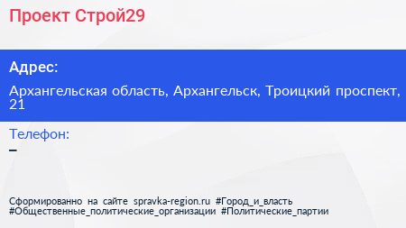 Проект-Строй29 по адресу Архангельская область, Архангельск, Троицкий проспект, 21 в дальнейшем Организация, размещена в следующих категориях: