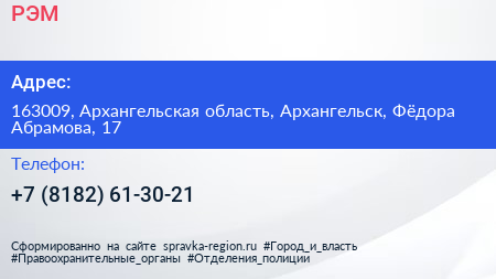 РЭМ по адресу 163009, Архангельская область, Архангельск, Фёдора Абрамова, 17 в дальнейшем Организация, размещена в следующих категориях: