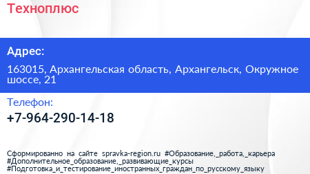 Техноплюс по адресу 163015, Архангельская область, Архангельск, Окружное шоссе, 21 в дальнейшем Организация, размещена в следующих категориях: