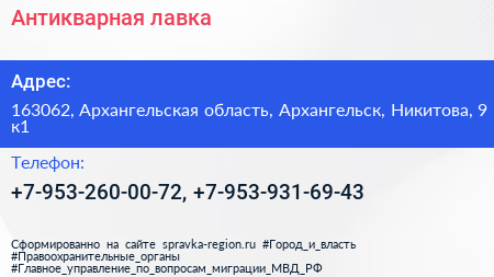 Антикварная лавка по адресу 163062, Архангельская область, Архангельск, Никитова, 9 к1 в дальнейшем Организация, размещена в следующих категориях: