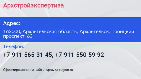 Архстройэкспертиза по адресу 163000, Архангельская область, Архангельск, Троицкий проспект, 63 в дальнейшем Организация, размещена в следующих категориях: