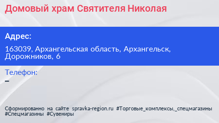 Домовый храм Святителя Николая по адресу 163039, Архангельская область, Архангельск, Дорожников, 6 в дальнейшем Организация, размещена в следующих категориях: