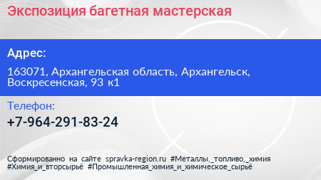Экспозиция, багетная мастерская по адресу 163071, Архангельская область, Архангельск, Воскресенская, 93 к1 в дальнейшем Организация, размещена в следующих категориях: