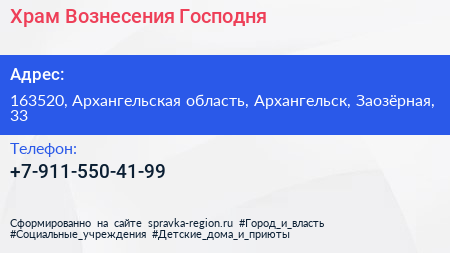 Храм Вознесения Господня по адресу 163520, Архангельская область, Архангельск, Заозёрная, 33 в дальнейшем Организация, размещена в следующих категориях: