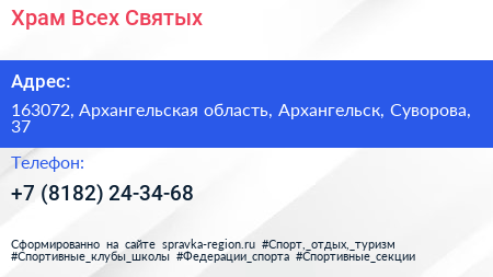 Храм Всех Святых по адресу 163072, Архангельская область, Архангельск, Суворова, 37 в дальнейшем Организация, размещена в следующих категориях: