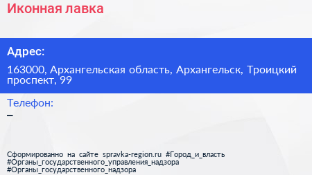 Иконная лавка по адресу 163000, Архангельская область, Архангельск, Троицкий проспект, 99 в дальнейшем Организация, размещена в следующих категориях: