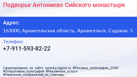Подворье Антониево-Сийского монастыря по адресу 163000, Архангельская область, Архангельск, Садовая, 5 в дальнейшем Организация, размещена в следующих категориях: