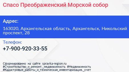 Спасо-Преображенский Морской собор по адресу 163020, Архангельская область, Архангельск, Никольский проспект, 28 в дальнейшем Организация, размещена в следующих категориях: