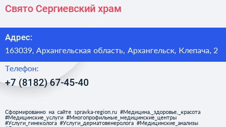 Свято-Сергиевский храм по адресу 163039, Архангельская область, Архангельск, Клепача, 2 в дальнейшем Организация, размещена в следующих категориях: