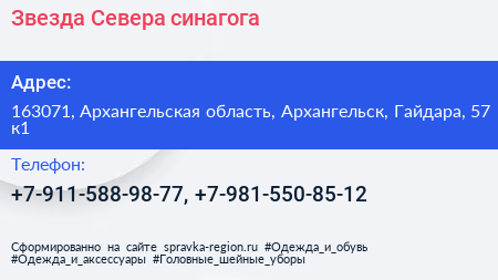 Звезда Севера, синагога по адресу 163071, Архангельская область, Архангельск, Гайдара, 57 к1 в дальнейшем Организация, размещена в следующих категориях: