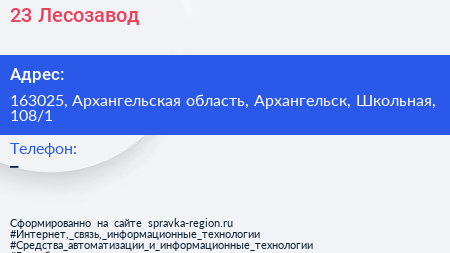 23 Лесозавод по адресу 163025, Архангельская область, Архангельск, Школьная, 108/1 в дальнейшем Организация, размещена в следующих категориях: