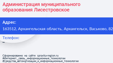 Администрация муниципального образования Лисестровское по адресу 163512, Архангельская область, Архангельск, Васьково, 82 в дальнейшем Организация, размещена в следующих категориях: