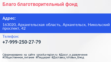 Благо, благотворительный фонд по адресу 163020, Архангельская область, Архангельск, Никольский проспект, 42 в дальнейшем Организация, размещена в следующих категориях:
