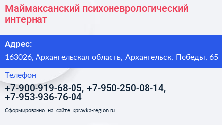 Маймаксанский психоневрологический интернат по адресу 163026, Архангельская область, Архангельск, Победы, 65 в дальнейшем Организация, размещена в следующих категориях: