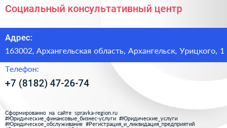 Социальный консультативный центр по адресу 163002, Архангельская область, Архангельск, Урицкого, 1 в дальнейшем Организация, размещена в следующих категориях: