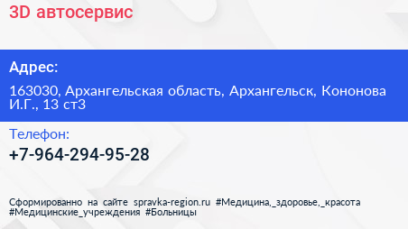 3D, автосервис по адресу 163030, Архангельская область, Архангельск, Кононова И.Г., 13 ст3 в дальнейшем Организация, размещена в следующих категориях: