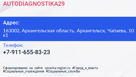 AUTODIAGNOSTIKA29 по адресу 163002, Архангельская область, Архангельск, Чапаева, 10 к1 в дальнейшем Организация, размещена в следующих категориях:
