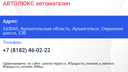 АВТОЛЮКС, автомагазин по адресу 163045, Архангельская область, Архангельск, Окружное шоссе, 13Б в дальнейшем Организация, размещена в следующих категориях: