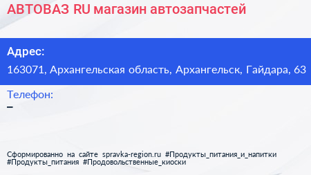 АВТОВАЗ.RU, магазин автозапчастей по адресу 163071, Архангельская область, Архангельск, Гайдара, 63 в дальнейшем Организация, размещена в следующих категориях: