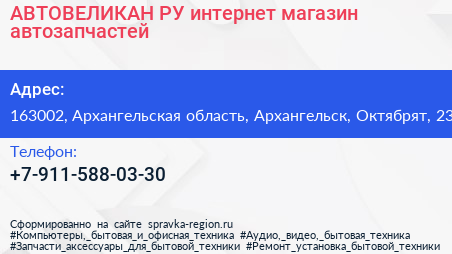 АВТОВЕЛИКАН.РУ, интернет-магазин автозапчастей по адресу 163002, Архангельская область, Архангельск, Октябрят, 23 в дальнейшем Организация, размещена в следующих категориях: