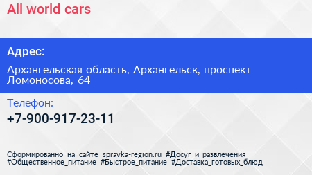 All world cars по адресу Архангельская область, Архангельск, проспект Ломоносова, 64 в дальнейшем Организация, размещена в следующих категориях: