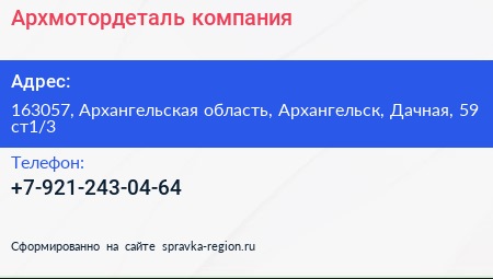 Архмотордеталь, компания по адресу 163057, Архангельская область, Архангельск, Дачная, 59 ст1/3 в дальнейшем Организация, размещена в следующих категориях: