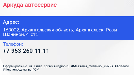 Аркуда, автосервис по адресу 163002, Архангельская область, Архангельск, Розы Шаниной, 4 ст1 в дальнейшем Организация, размещена в следующих категориях: