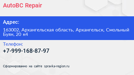 AutoBC Repair по адресу 163002, Архангельская область, Архангельск, Смольный Буян, 20 к4 в дальнейшем Организация, размещена в следующих категориях: