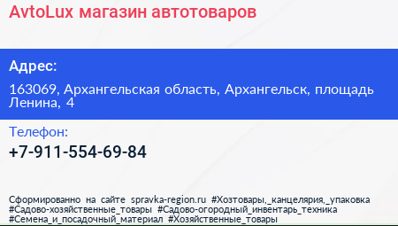 AvtoLux, магазин автотоваров по адресу 163069, Архангельская область, Архангельск, площадь Ленина, 4 в дальнейшем Организация, размещена в следующих категориях: