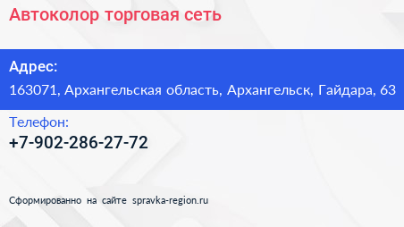 Автоколор, торговая сеть по адресу 163071, Архангельская область, Архангельск, Гайдара, 63 в дальнейшем Организация, размещена в следующих категориях: