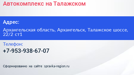 Автокомплекс на Талажском по адресу Архангельская область, Архангельск, Талажское шоссе, 22/2 ст1 в дальнейшем Организация, размещена в следующих категориях: